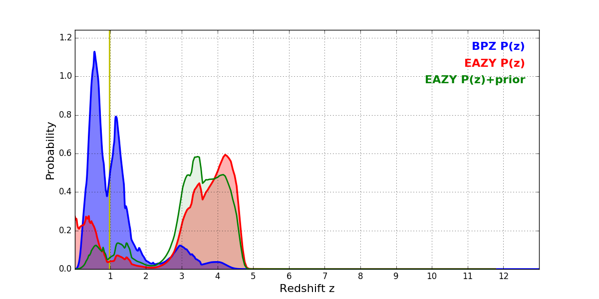 In P(z) plots: Yellow lines mark the cluster redshift z = 0.972,