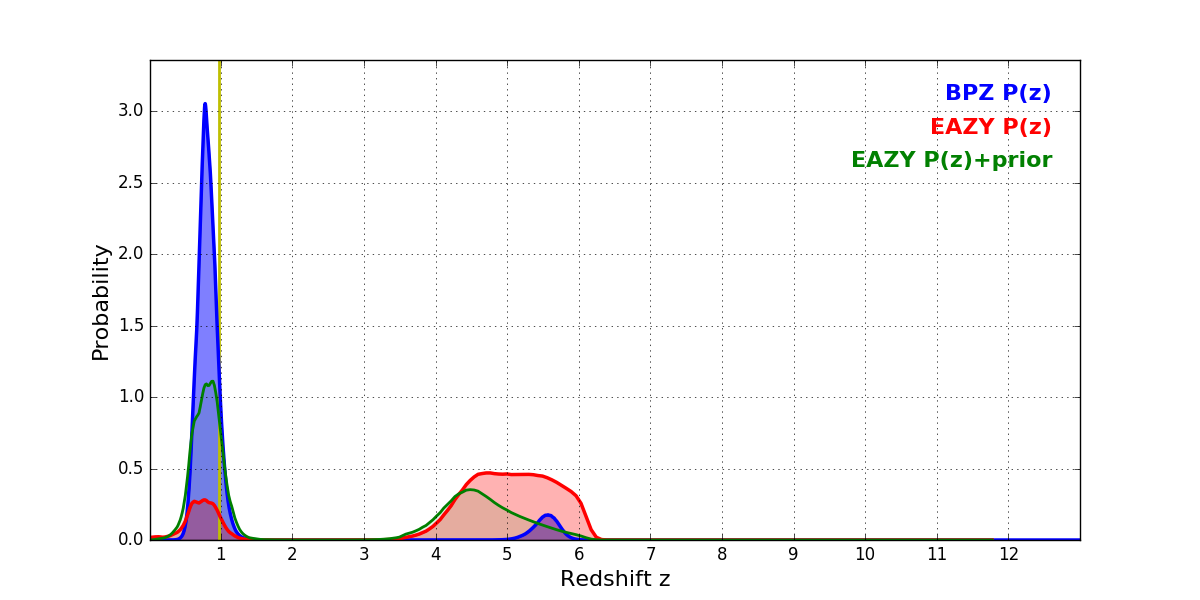 In P(z) plots: Yellow lines mark the cluster redshift z = 0.972,