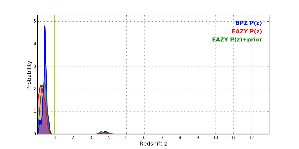 In P(z) plots: Yellow lines mark the cluster redshift z = 0.972,