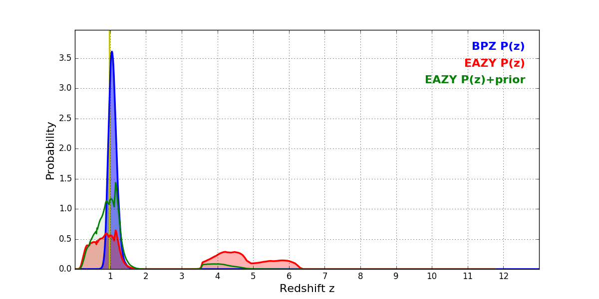 In P(z) plots: Yellow lines mark the cluster redshift z = 0.972,