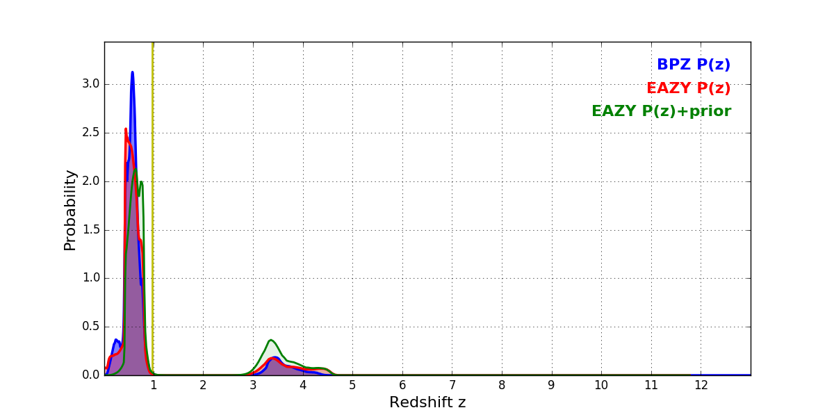 In P(z) plots: Yellow lines mark the cluster redshift z = 0.972,