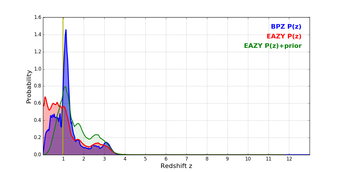 In P(z) plots: Yellow lines mark the cluster redshift z = 0.972,