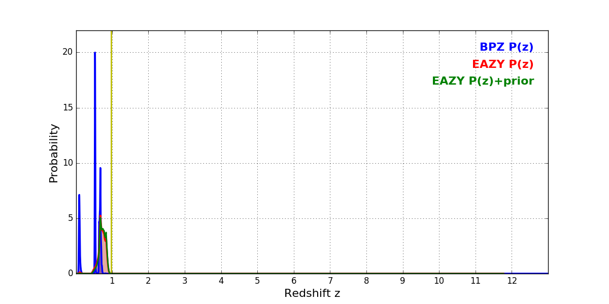In P(z) plots: Yellow lines mark the cluster redshift z = 0.972,