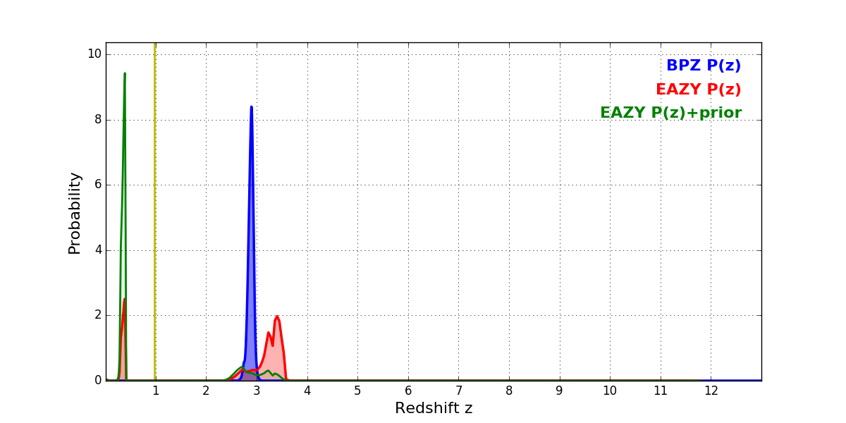 In P(z) plots: Yellow lines mark the cluster redshift z = 0.972,