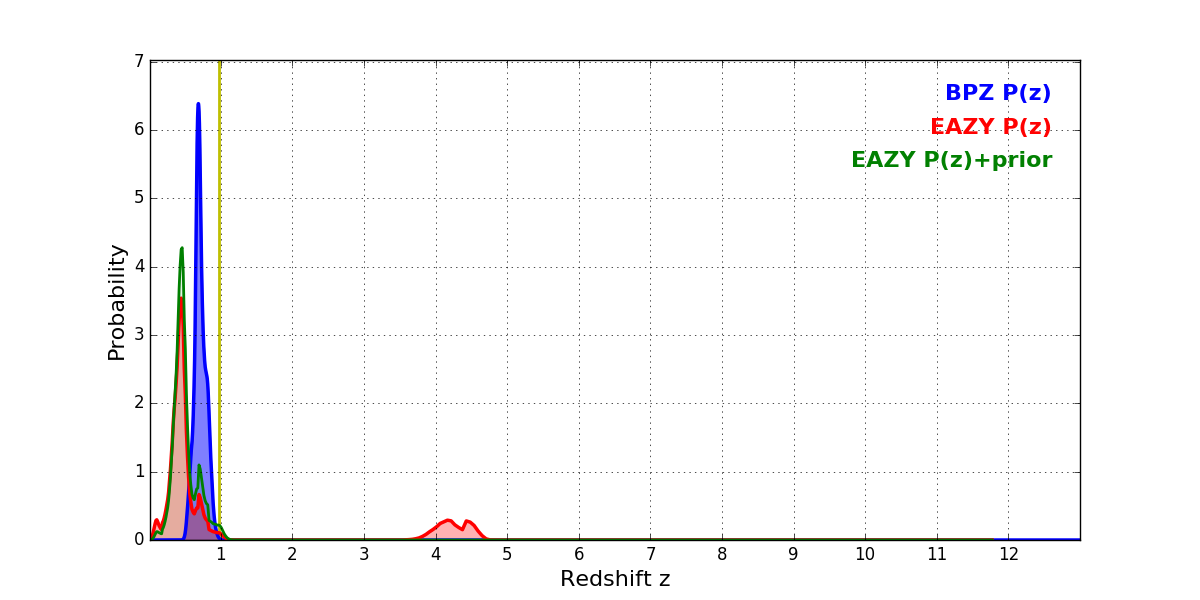 In P(z) plots: Yellow lines mark the cluster redshift z = 0.972,