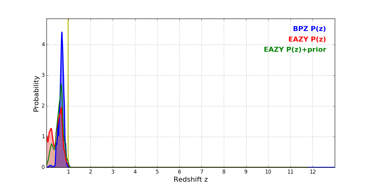 In P(z) plots: Yellow lines mark the cluster redshift z = 0.972,