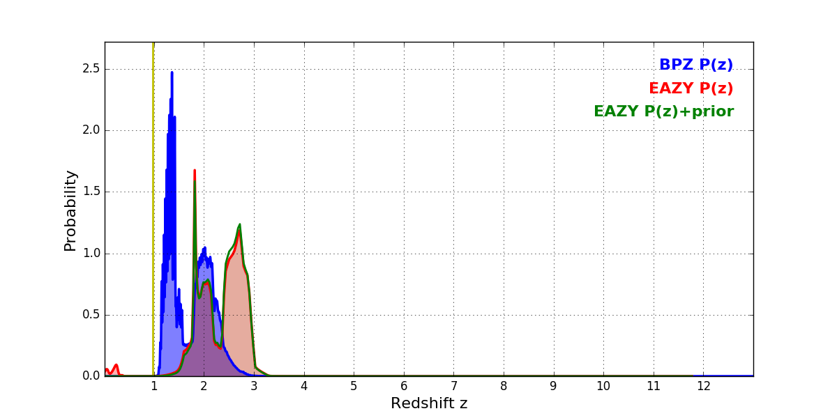 In P(z) plots: Yellow lines mark the cluster redshift z = 0.972,
