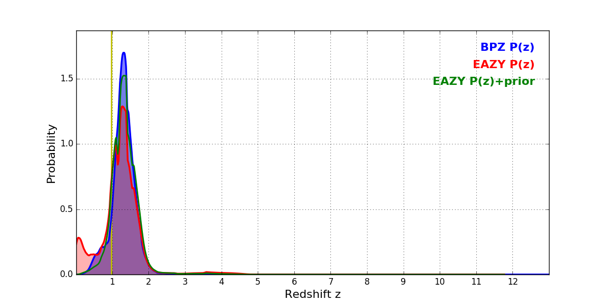 In P(z) plots: Yellow lines mark the cluster redshift z = 0.972,