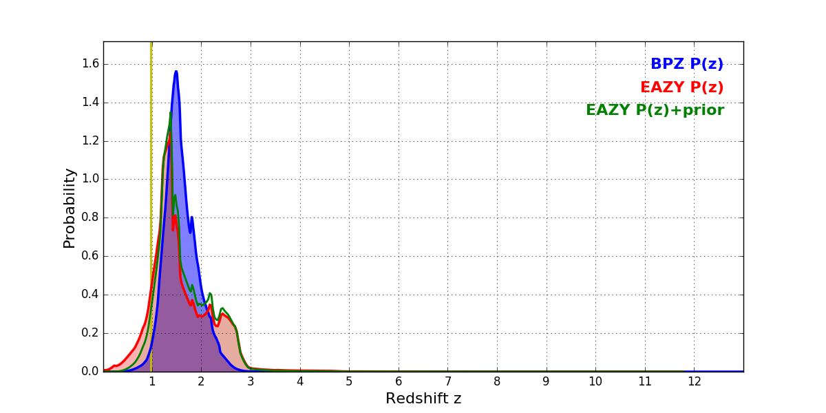 In P(z) plots: Yellow lines mark the cluster redshift z = 0.972,