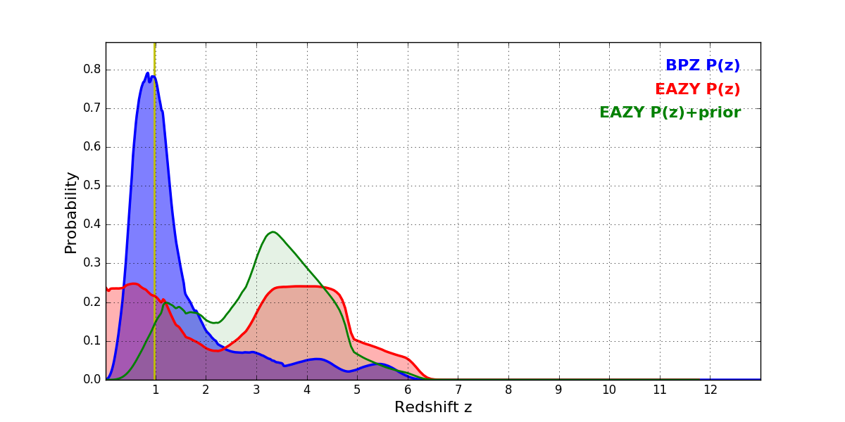 In P(z) plots: Yellow lines mark the cluster redshift z = 0.972,