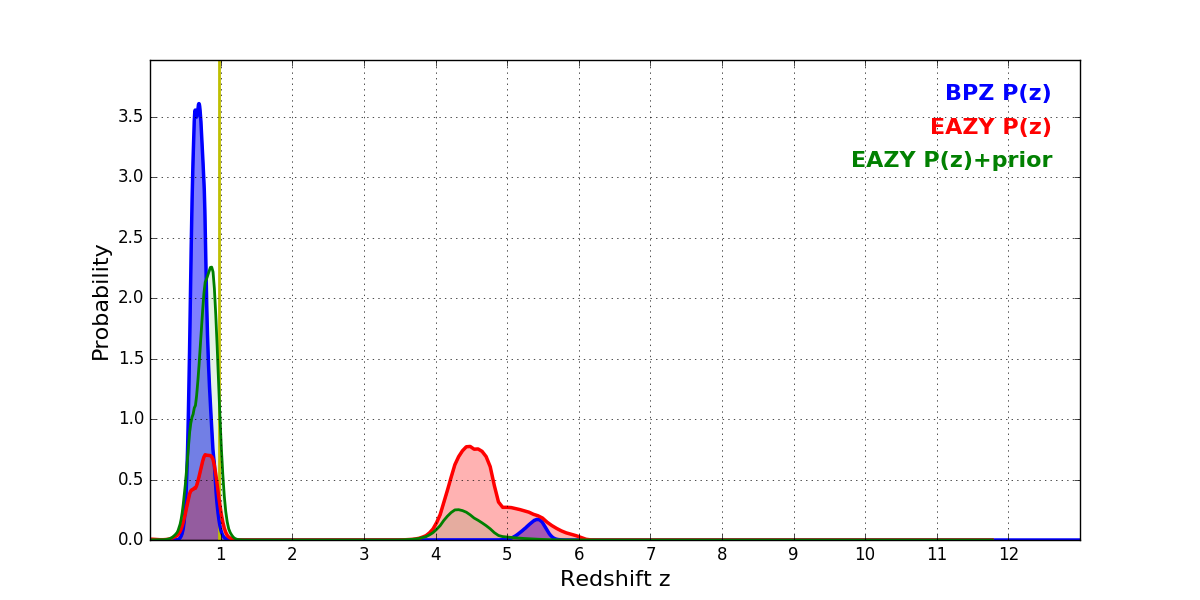 In P(z) plots: Yellow lines mark the cluster redshift z = 0.972,