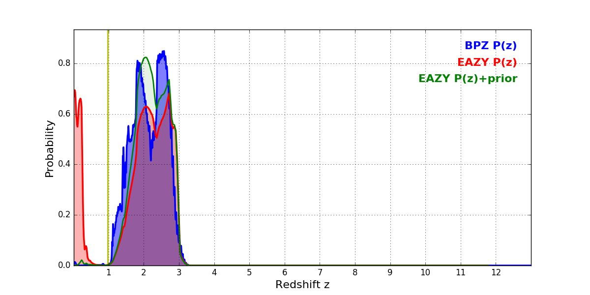 In P(z) plots: Yellow lines mark the cluster redshift z = 0.972,