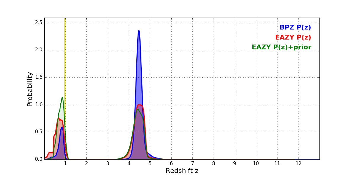 In P(z) plots: Yellow lines mark the cluster redshift z = 0.972,