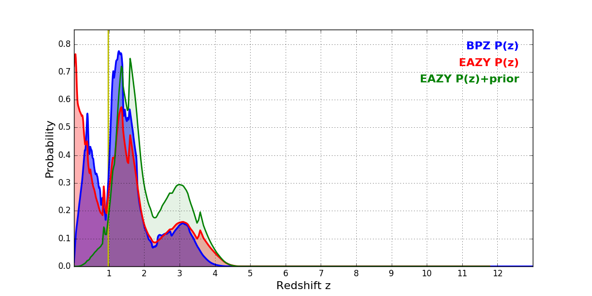 In P(z) plots: Yellow lines mark the cluster redshift z = 0.972,