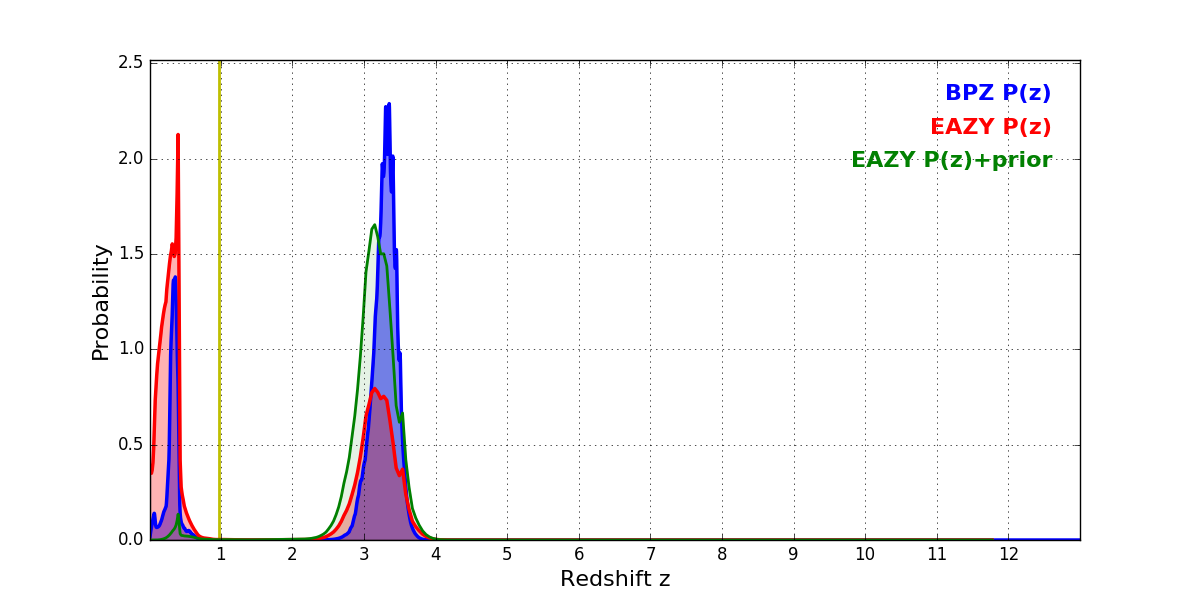In P(z) plots: Yellow lines mark the cluster redshift z = 0.972,
