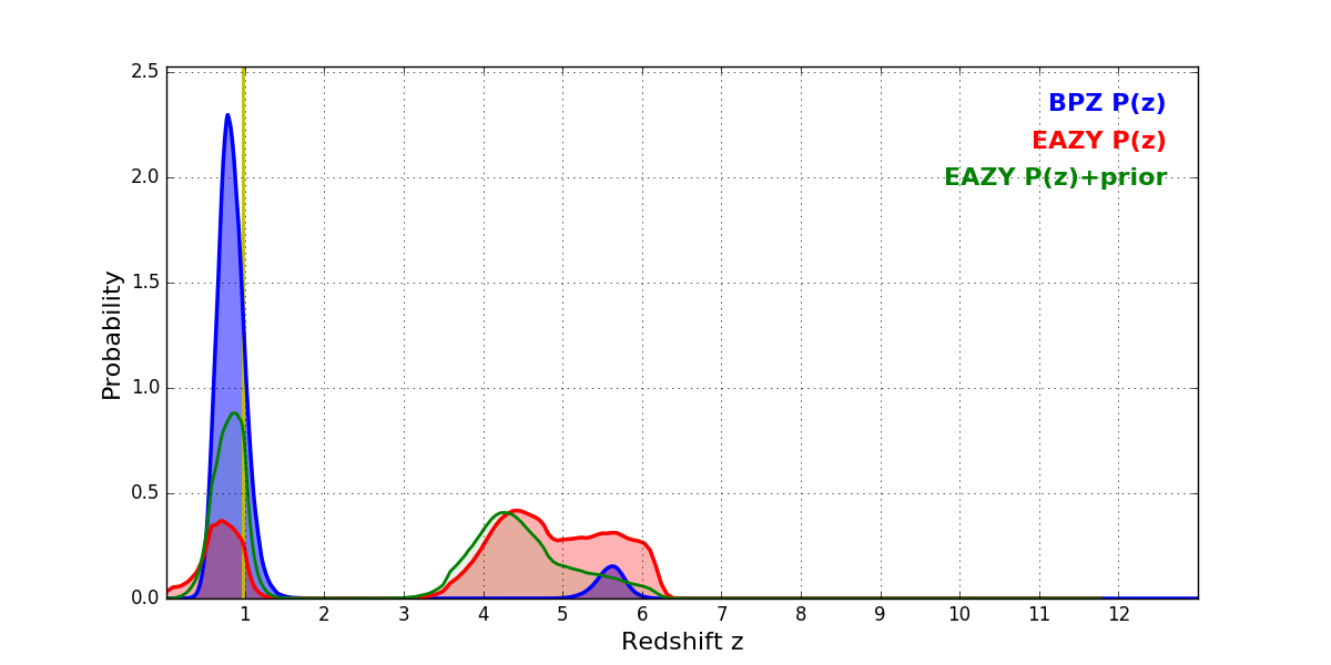 In P(z) plots: Yellow lines mark the cluster redshift z = 0.972,