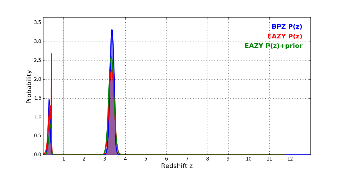 In P(z) plots: Yellow lines mark the cluster redshift z = 0.972,
