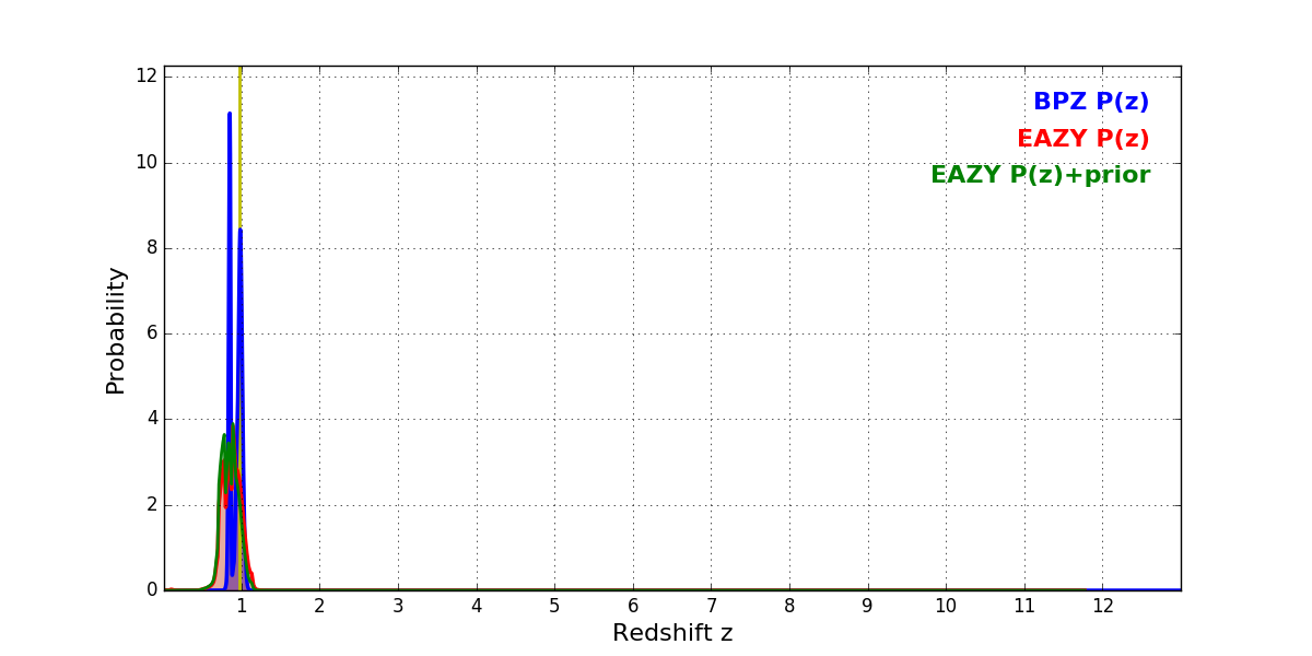 In P(z) plots: Yellow lines mark the cluster redshift z = 0.972,