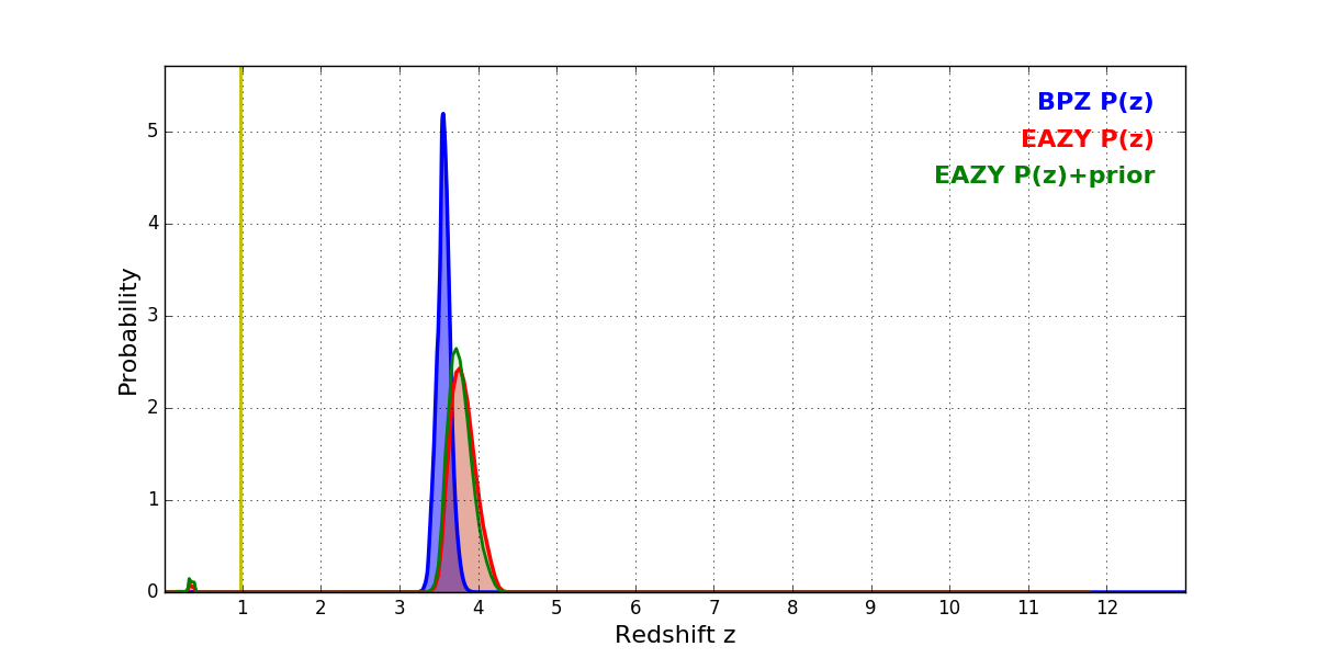 In P(z) plots: Yellow lines mark the cluster redshift z = 0.972,