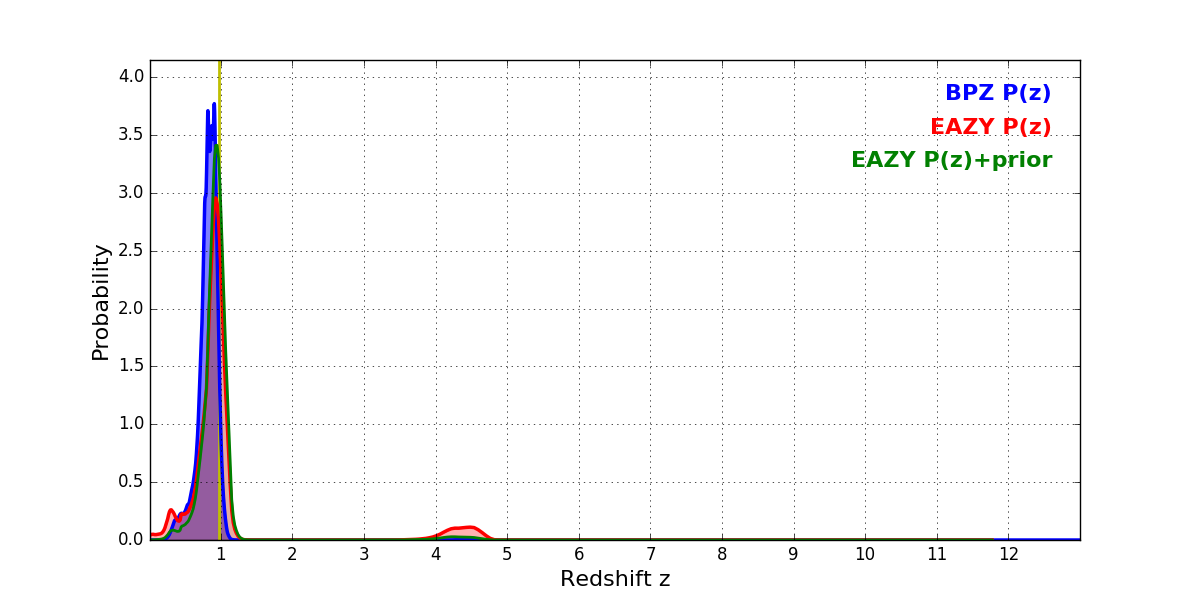 In P(z) plots: Yellow lines mark the cluster redshift z = 0.972,