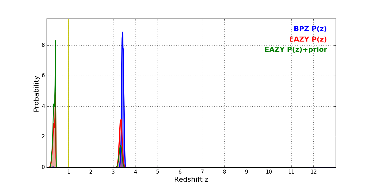 In P(z) plots: Yellow lines mark the cluster redshift z = 0.972,