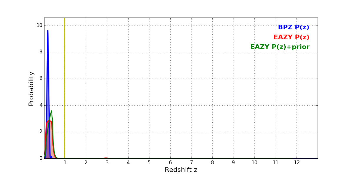 In P(z) plots: Yellow lines mark the cluster redshift z = 0.972,