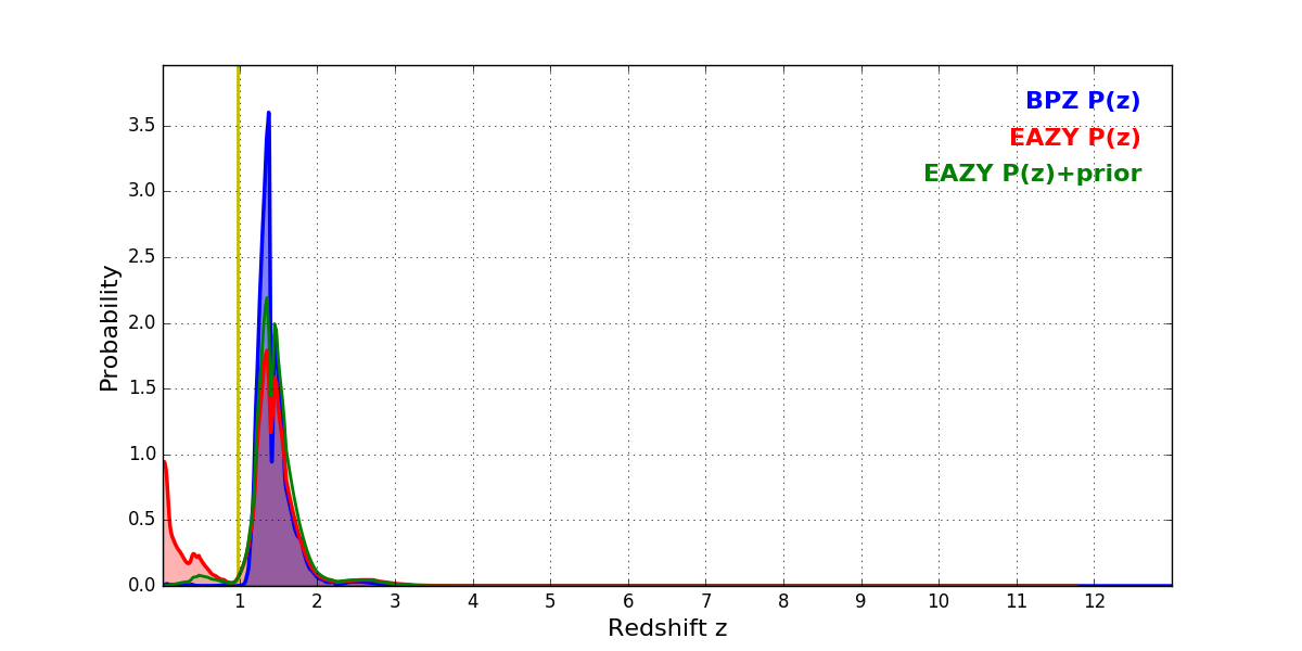 In P(z) plots: Yellow lines mark the cluster redshift z = 0.972,