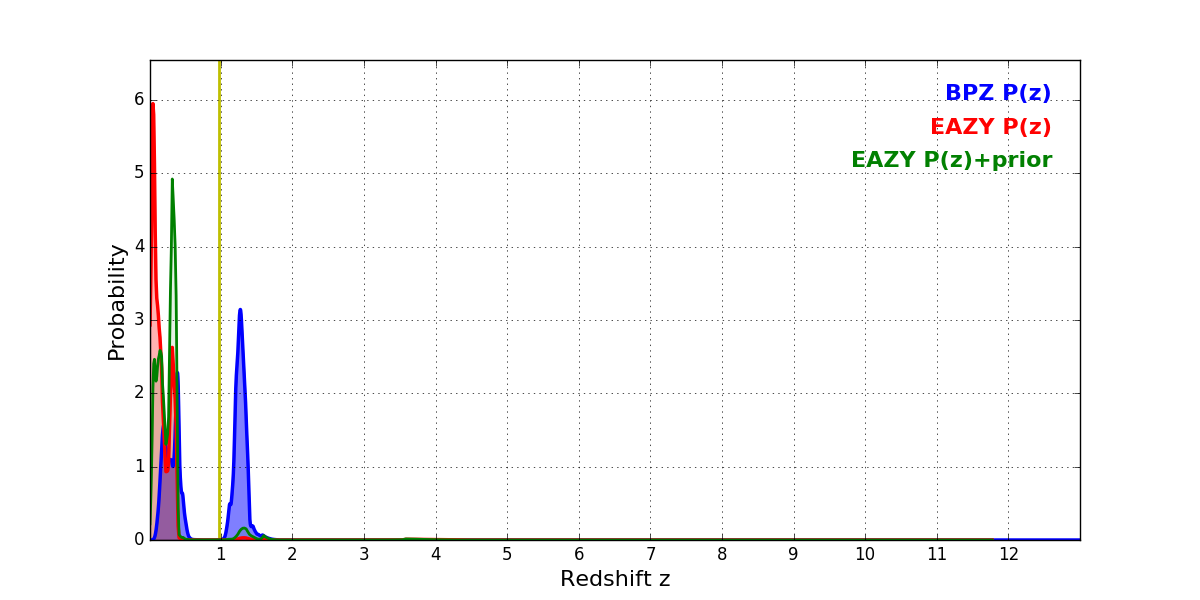 In P(z) plots: Yellow lines mark the cluster redshift z = 0.972,