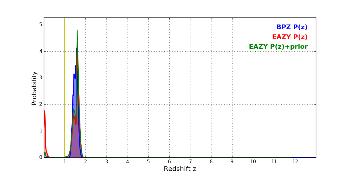 In P(z) plots: Yellow lines mark the cluster redshift z = 0.972,