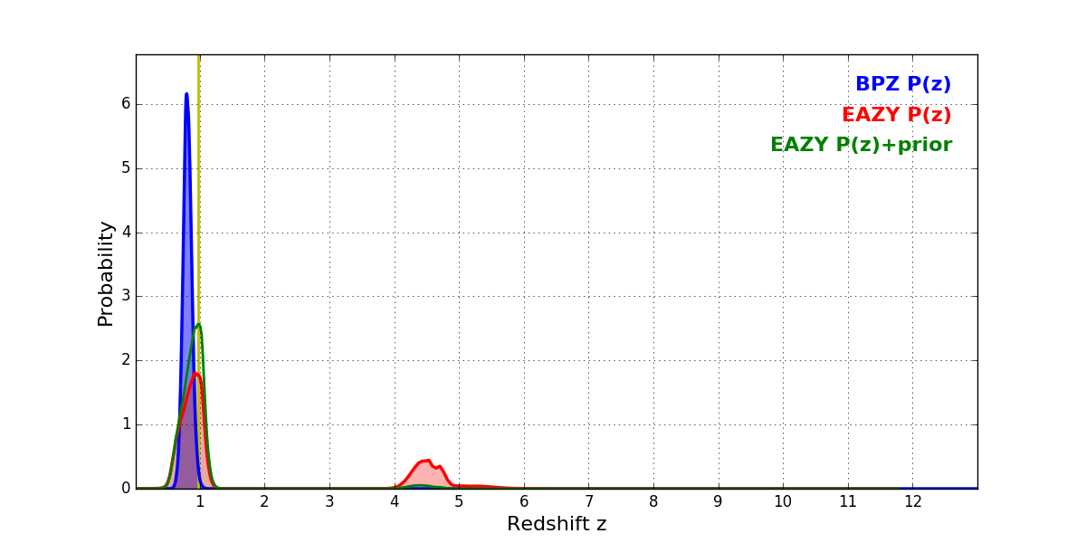 In P(z) plots: Yellow lines mark the cluster redshift z = 0.972,
