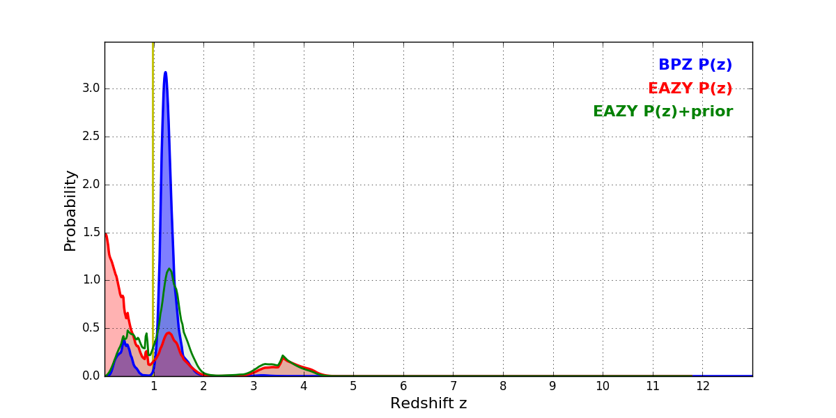 In P(z) plots: Yellow lines mark the cluster redshift z = 0.972,