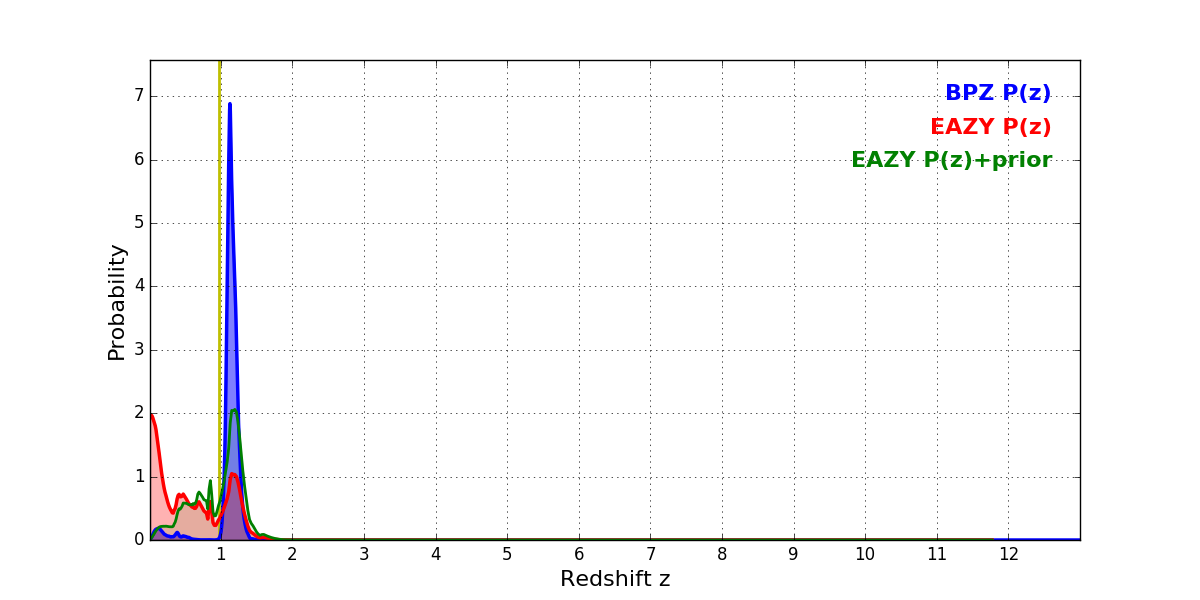 In P(z) plots: Yellow lines mark the cluster redshift z = 0.972,