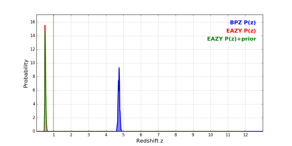 In P(z) plots: Yellow lines mark the cluster redshift z = 0.972,