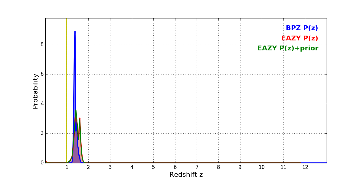 In P(z) plots: Yellow lines mark the cluster redshift z = 0.972,