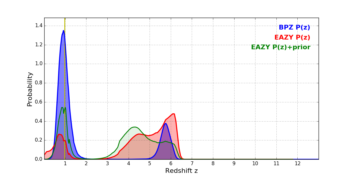 In P(z) plots: Yellow lines mark the cluster redshift z = 0.972,