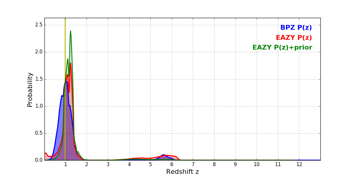 In P(z) plots: Yellow lines mark the cluster redshift z = 0.972,