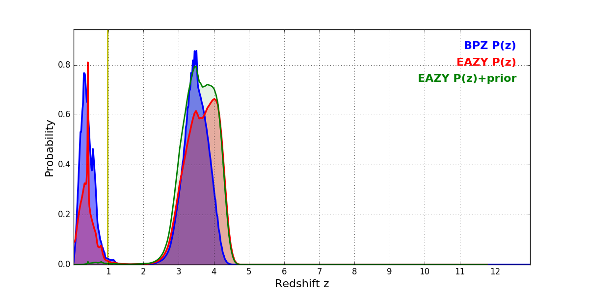 In P(z) plots: Yellow lines mark the cluster redshift z = 0.972,
