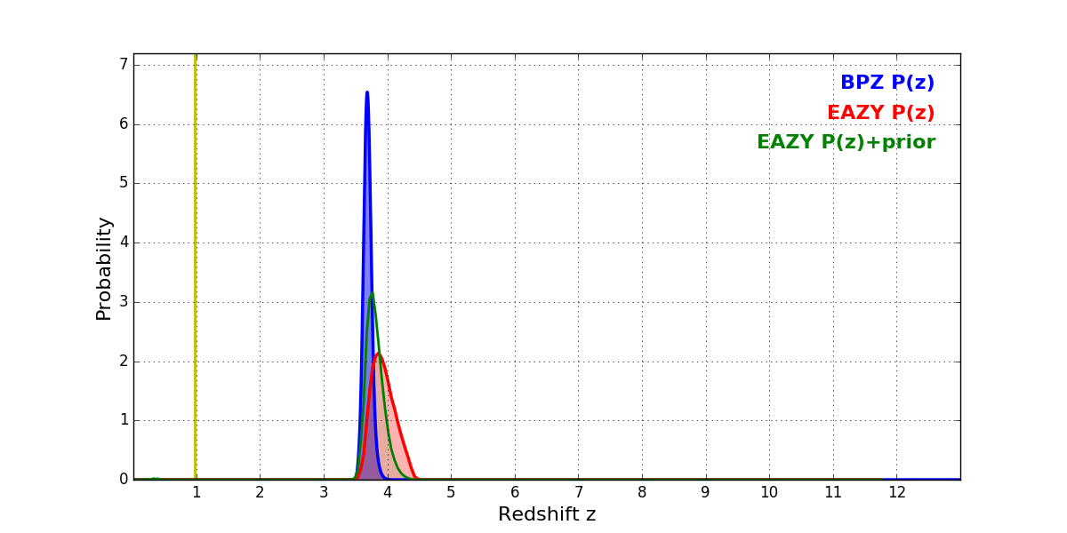 In P(z) plots: Yellow lines mark the cluster redshift z = 0.972,