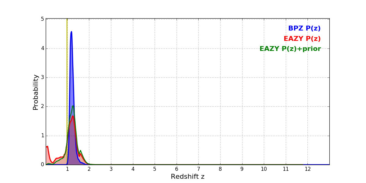 In P(z) plots: Yellow lines mark the cluster redshift z = 0.972,
