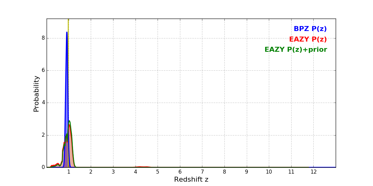 In P(z) plots: Yellow lines mark the cluster redshift z = 0.972,