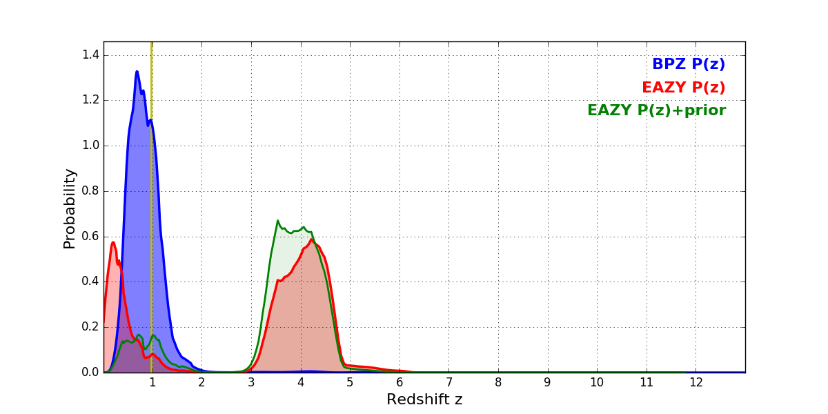 In P(z) plots: Yellow lines mark the cluster redshift z = 0.972,