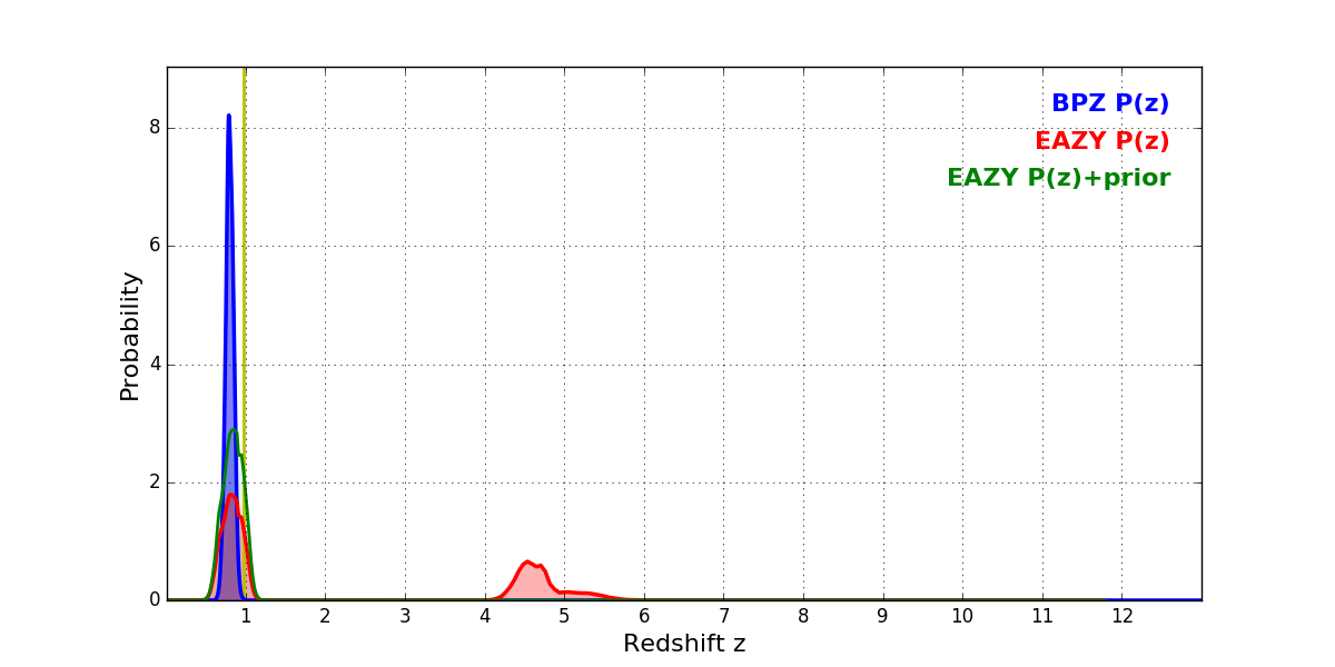 In P(z) plots: Yellow lines mark the cluster redshift z = 0.972,