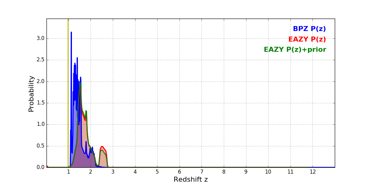In P(z) plots: Yellow lines mark the cluster redshift z = 0.972,