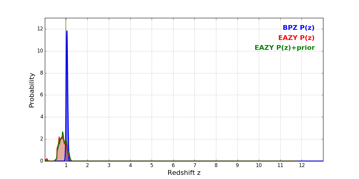 In P(z) plots: Yellow lines mark the cluster redshift z = 0.972,