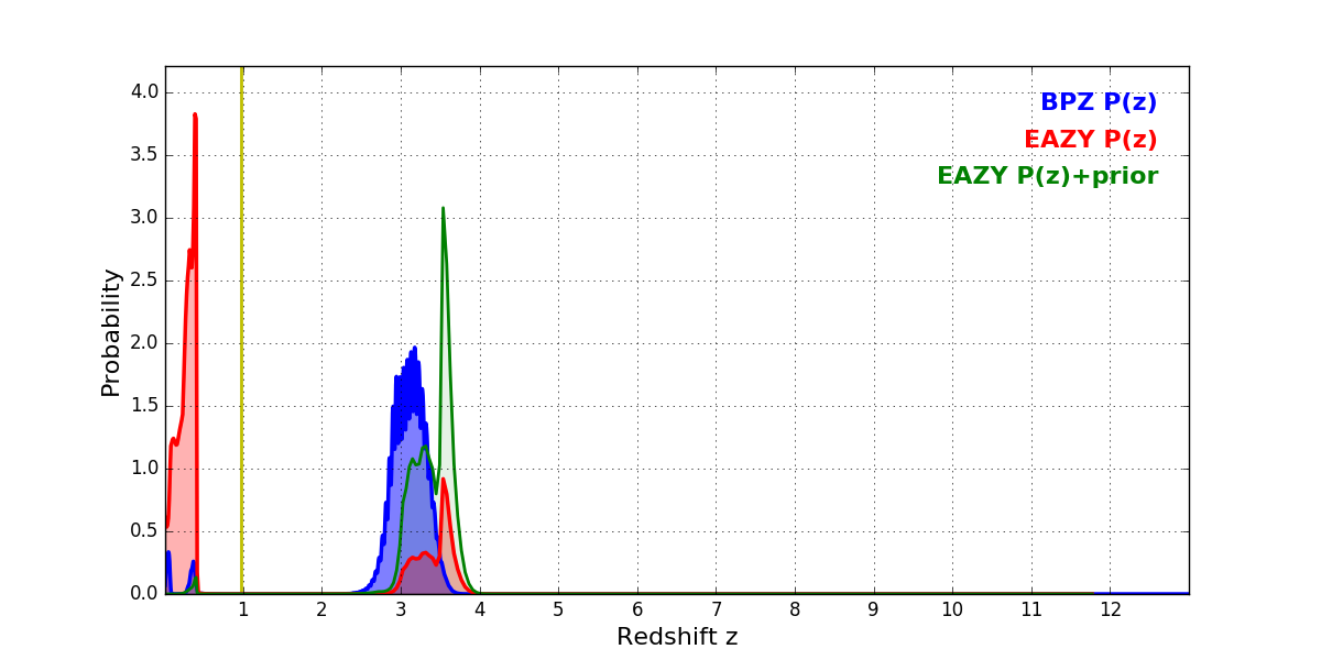 In P(z) plots: Yellow lines mark the cluster redshift z = 0.972,