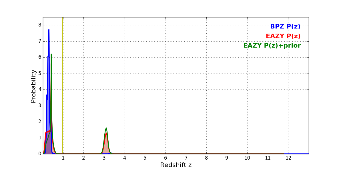 In P(z) plots: Yellow lines mark the cluster redshift z = 0.972,