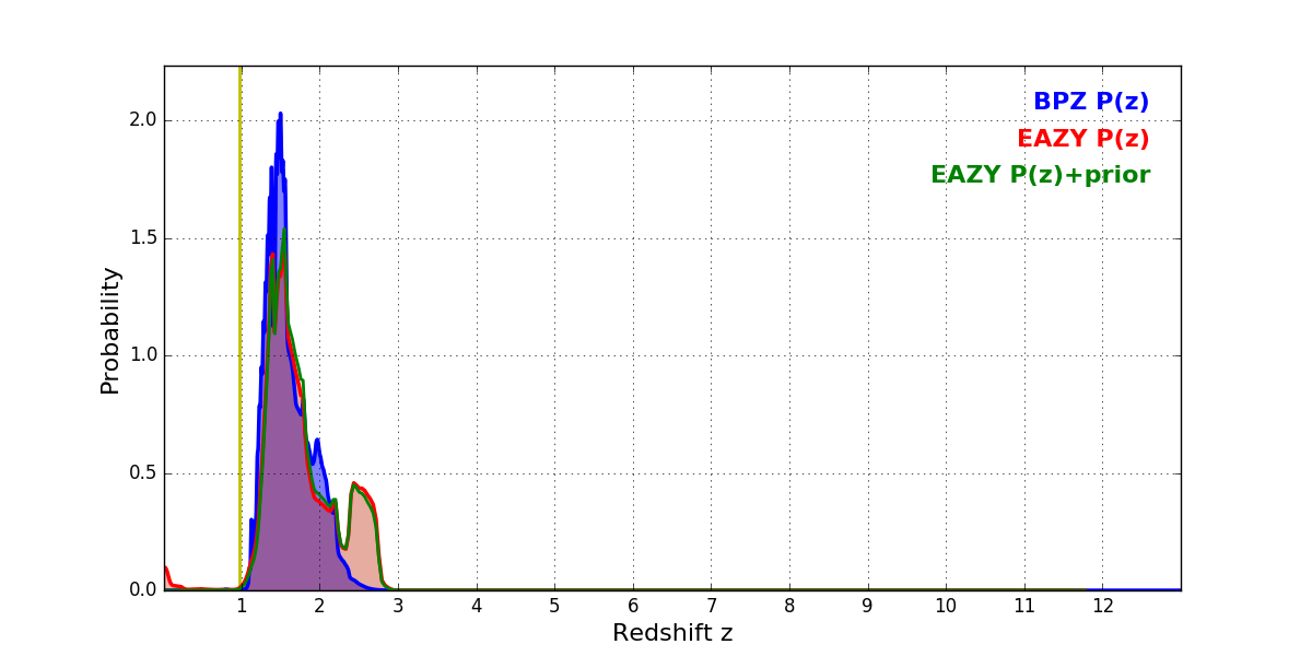 In P(z) plots: Yellow lines mark the cluster redshift z = 0.972,