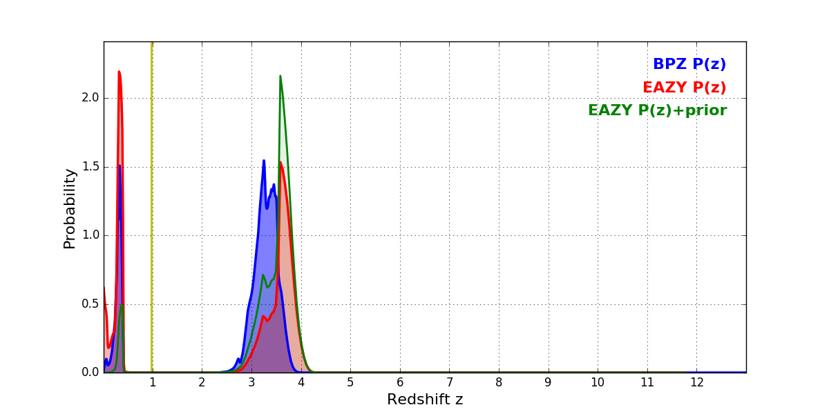 In P(z) plots: Yellow lines mark the cluster redshift z = 0.972,