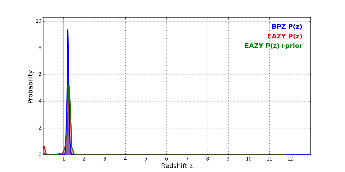 In P(z) plots: Yellow lines mark the cluster redshift z = 0.972,