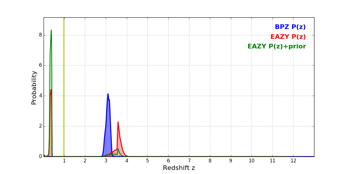 In P(z) plots: Yellow lines mark the cluster redshift z = 0.972,